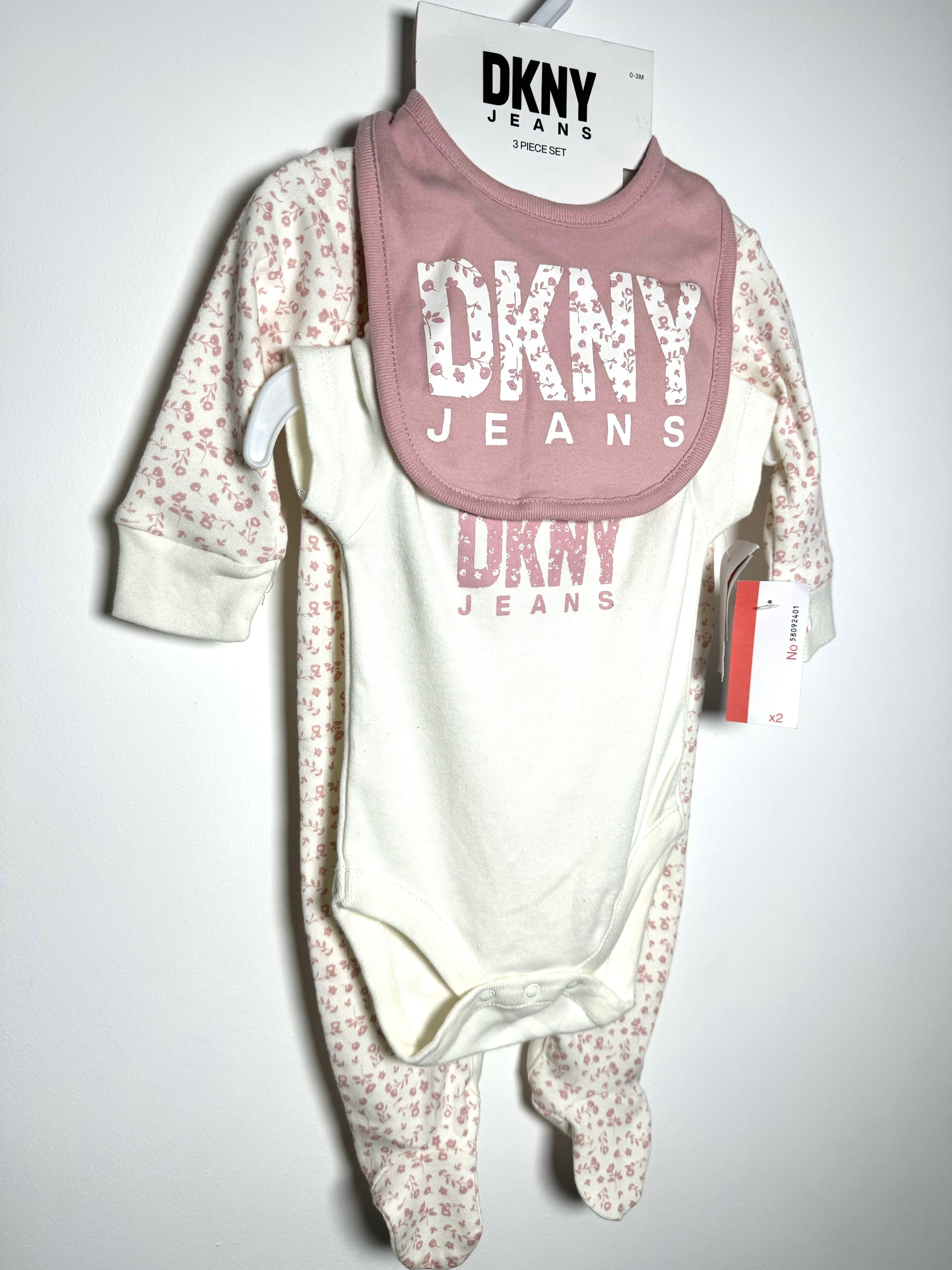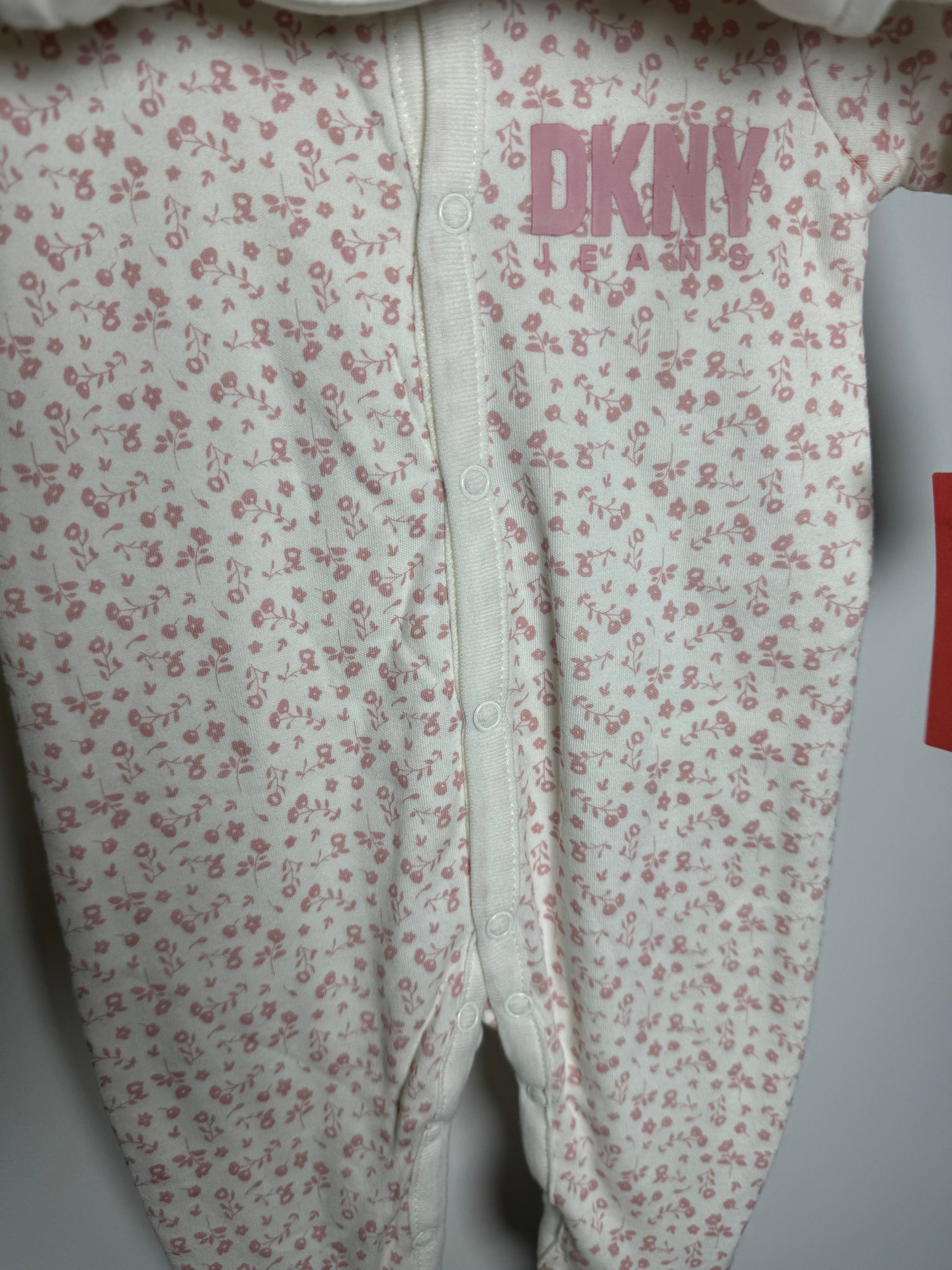 This DKNY 3-piece set is perfect for your newborn baby girl. The set includes a comfortable onesie, a soft hat, and a pair of cozy booties, all designed with delicate colors and patterns. Keep your baby looking stylish and feeling comfortable with this adorable set. Made for ages 0-3 months.